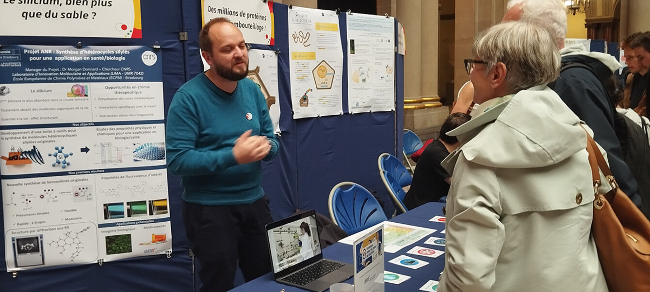 Ce stand a été réalisé dans le cadre d'une action coordonnée par le CNRS Alsace afin de mettre en avant auprès du grand public les projets financés récemment par l'ANR (Agence Nationale pour la Recherche). Ainsi, c'est le projet C-Sil, visant la synthèse et l'étude d'hétérocycles silylés qui a été mis à l'honneur (M. Donnard).